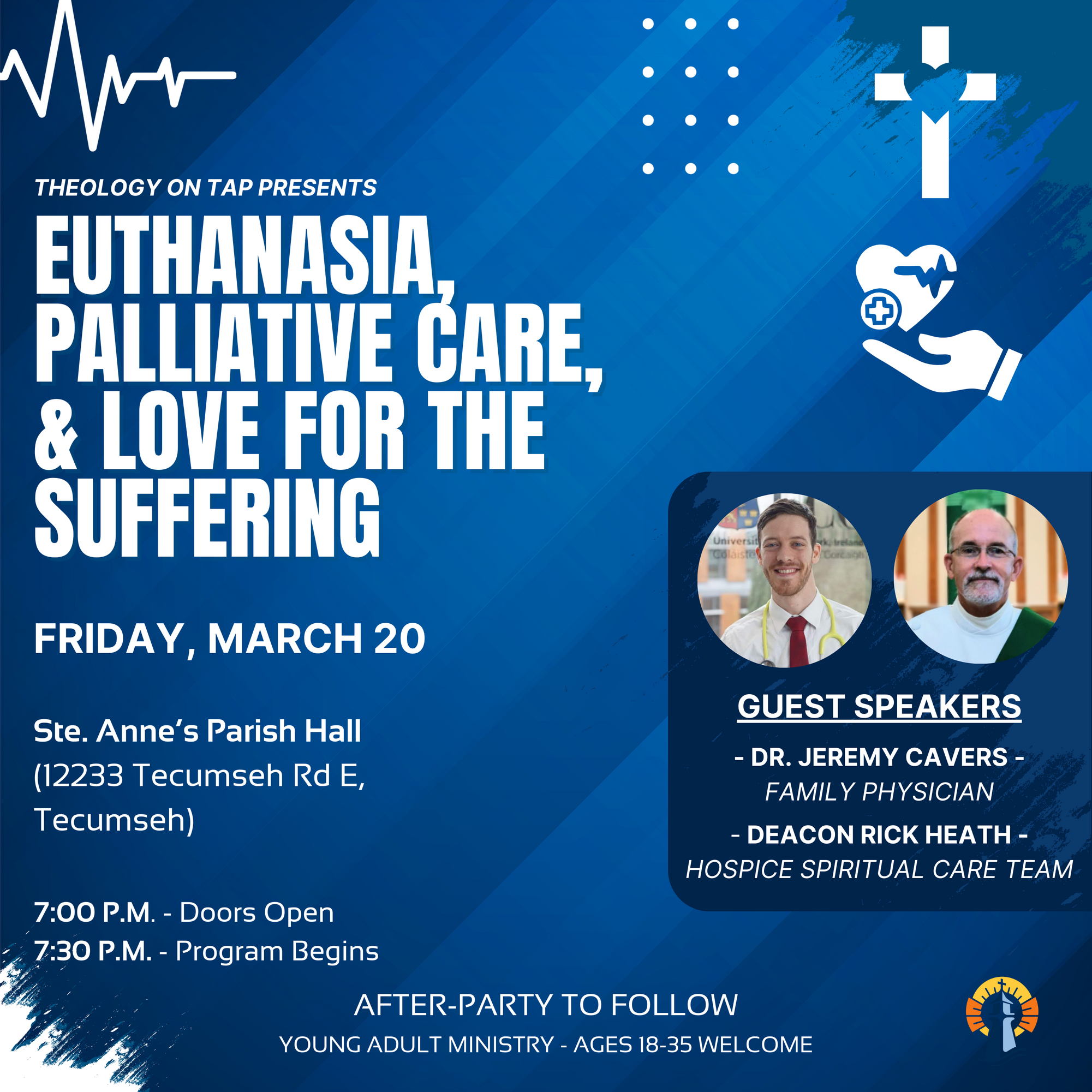 Young Adults! Our next Theology on Tap lecture will help us understand the current state of euthanasia in Canada, as well as bring hope and purpose to suffering by better understanding palliative care. Then join us for an After Party and fellowship at Johnny Shotz!